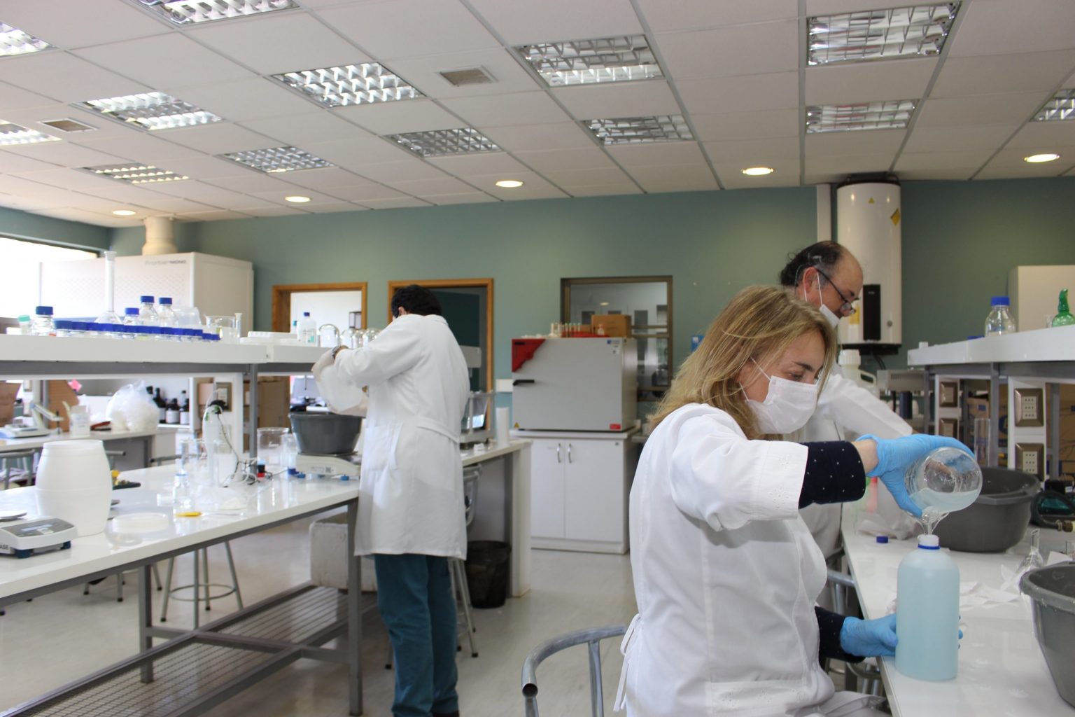 En la soledad de un campus cuyo funcionamiento está reducido al mínimo por la contingencia sanitaria nacional e internacional, los académicos Annemarie Nielsen, Alejandro Jerez y Joel Pardo pasan horas colaborando en la preparación de alcohol gel para abastecer a todos los campus de la Universidad Austral de Chile. Este apoyo fue solicitado por la Dirección de Servicios UACh según lo informó Juan Claudio Rodríguez, profesional del Departamento de Prevención de Riesgos de la UACh (ver nota relacionada).